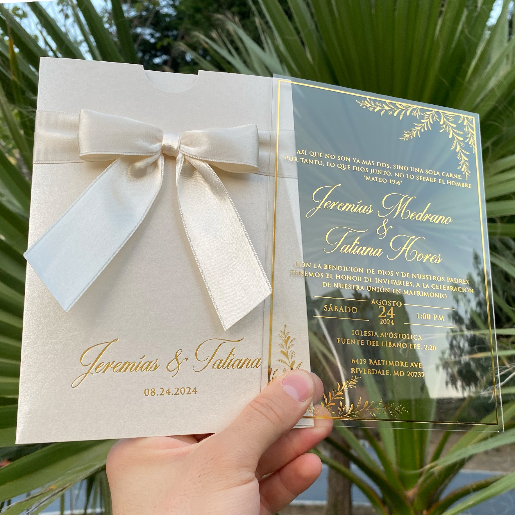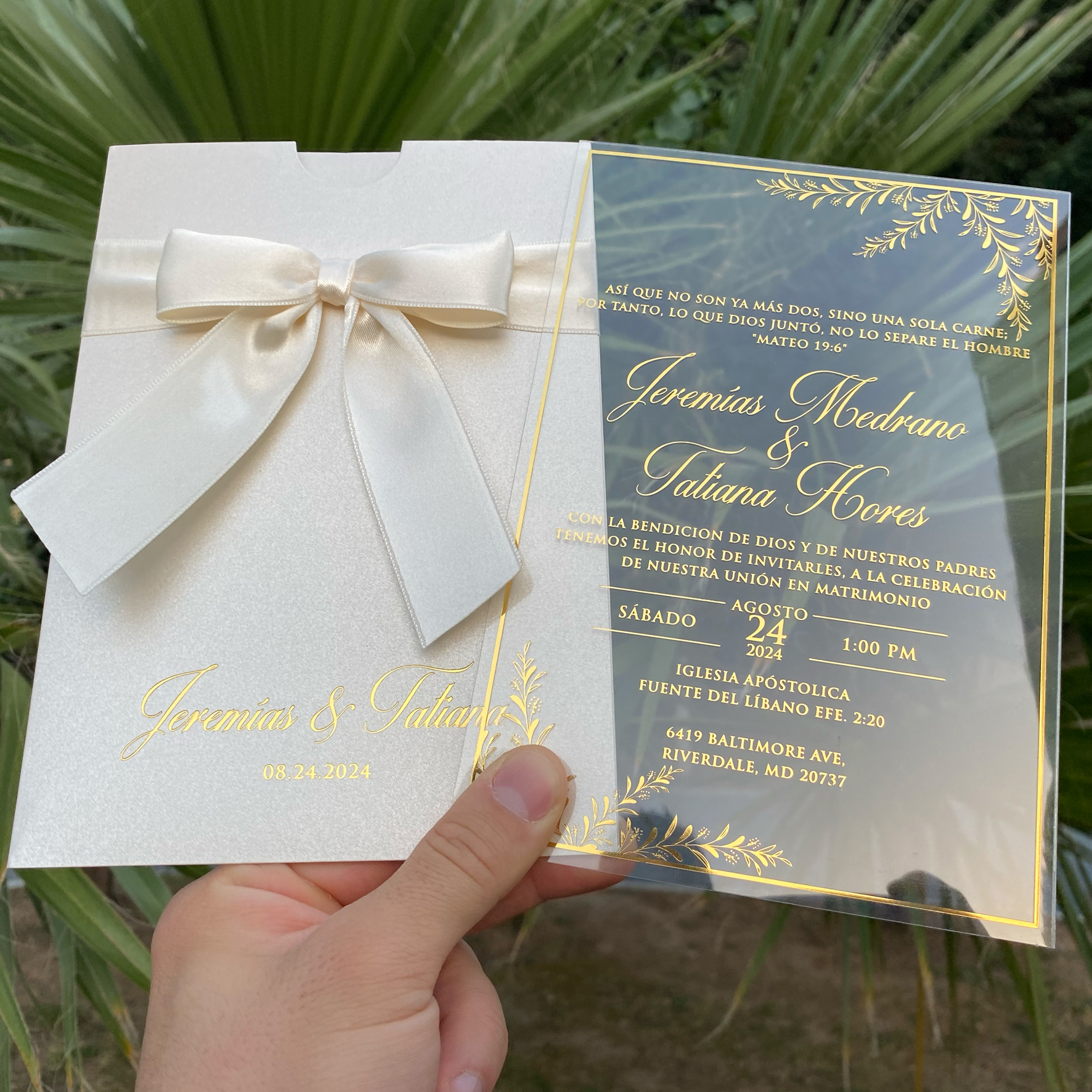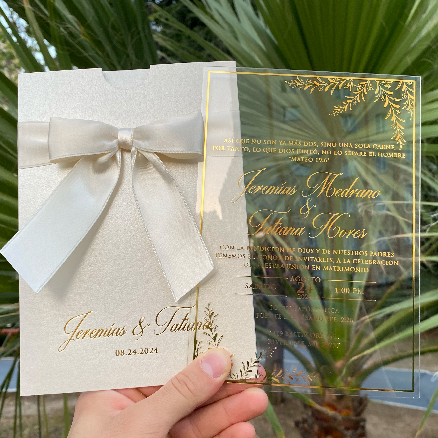 Acrylic wedding invitation, Wedding invitation, Ivory mother-of-pearl envelope with ribbon and gold foil print, Clear acrylic invitation