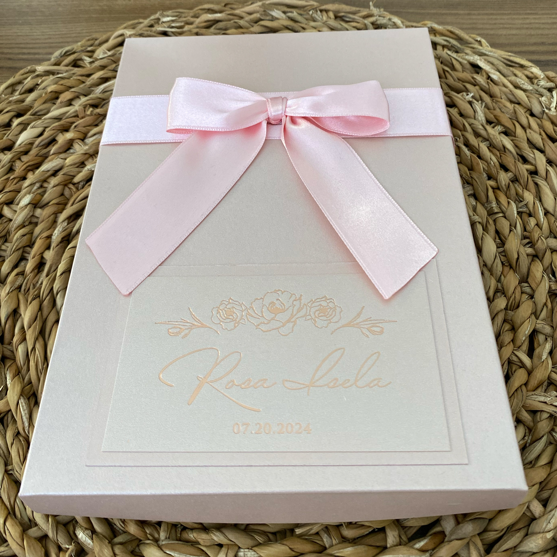 - Rose gold foil printed and rose pearl invitation box with ribbon (foil color, ribbon color and box color can be changed)