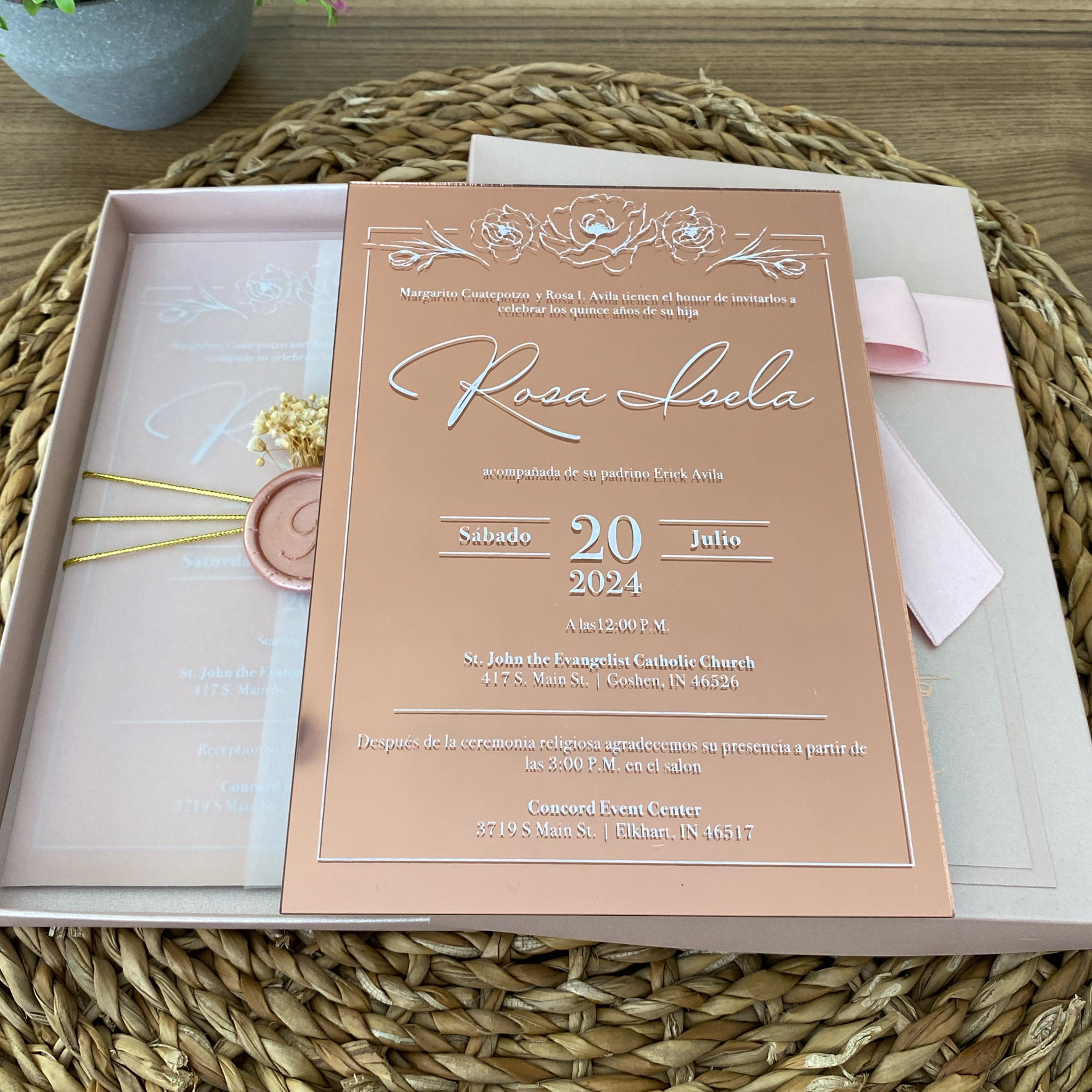 Tags: Rose gold mirrored invitation, Boxed invitation, Mirrored invitation, Mirrored wedding invitation, Quince invitation, Quinceañera, Quince Años