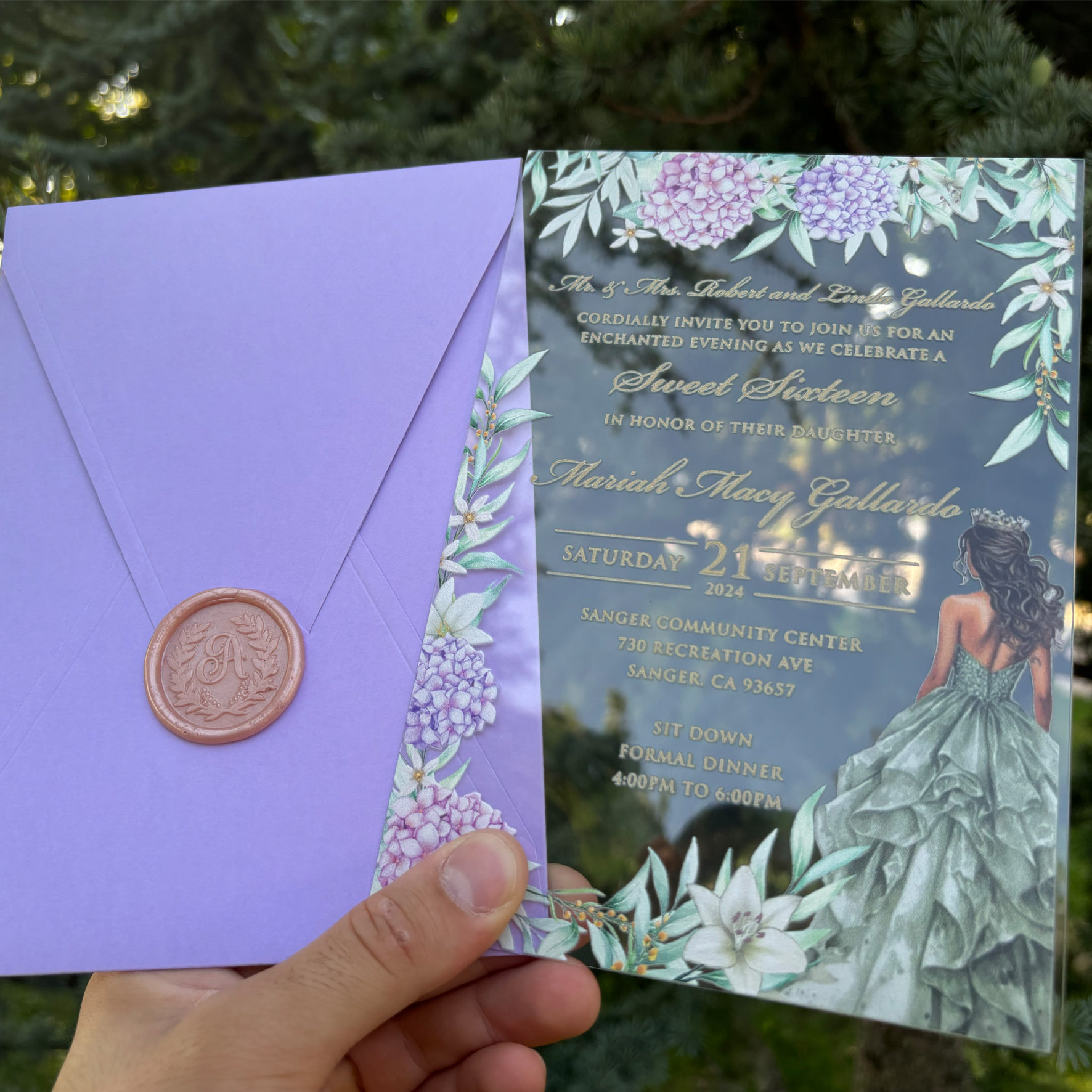 Tags: Sweet 16 invitation, Acrylic birthday invitation, Quinceañera invitation, UV print, Lilac envelope, Rose wax seal
