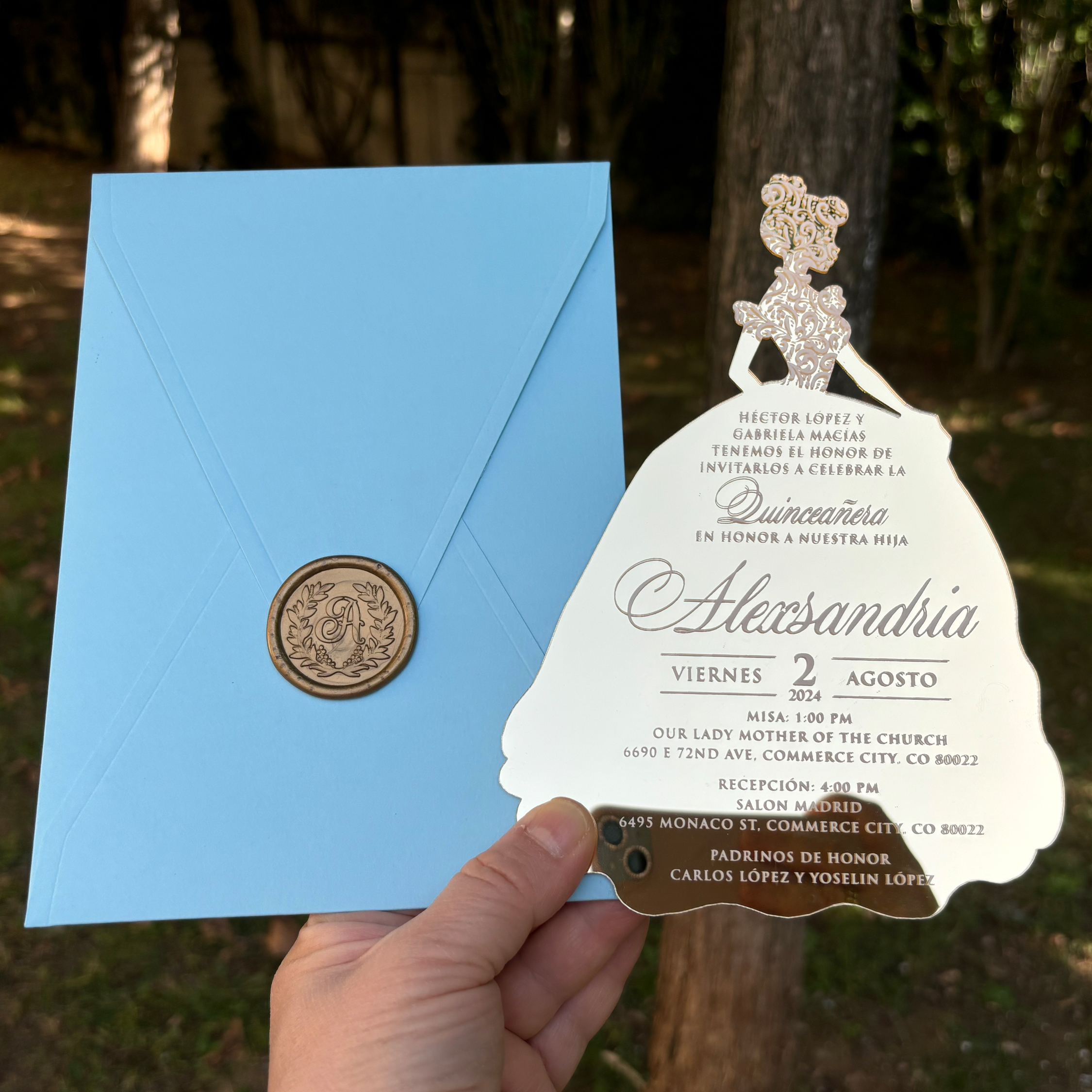 Mirrored princess invitation, Gold mirrored Quinceañera invitation, Quince invitation, Mis 15 Años invitation, Powder blue envelope, Gold wax seal