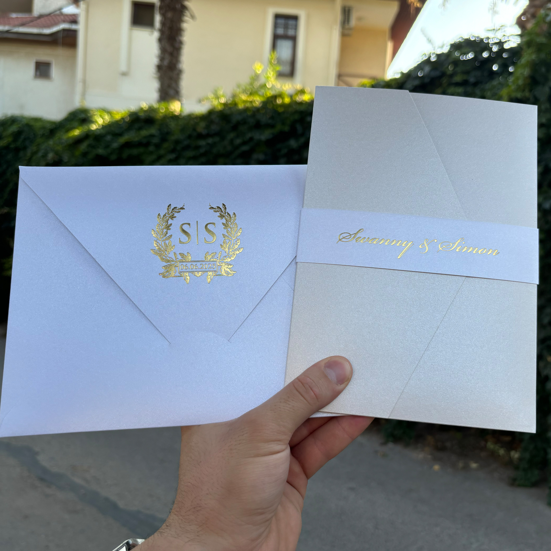 White printed gold mirrored invitation + Pearlescent pocket envelope + Bally band + Detail Card + Mailing envelope