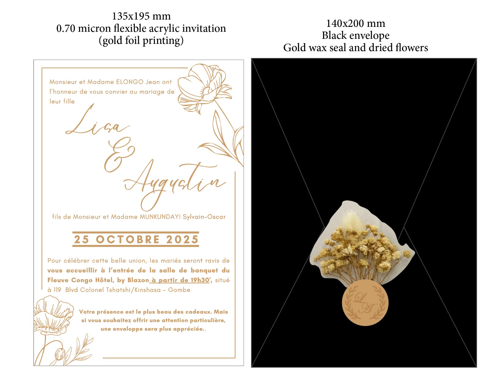 *0.70 micron flexible acrylic invitation (Gold foil printed)